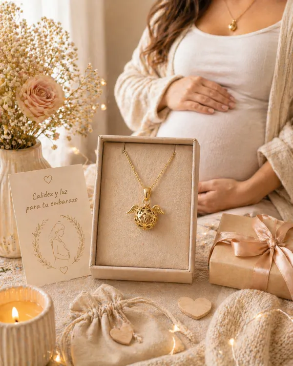 Si la plata tiene una elegancia fría y atemporal, el llamador de ángeles dorado irradia calidez y feminidad. Es la elección perfecta para las mamás que quieren una joya luminosa, que capte la luz y acompañe los momentos más especiales del embarazo.